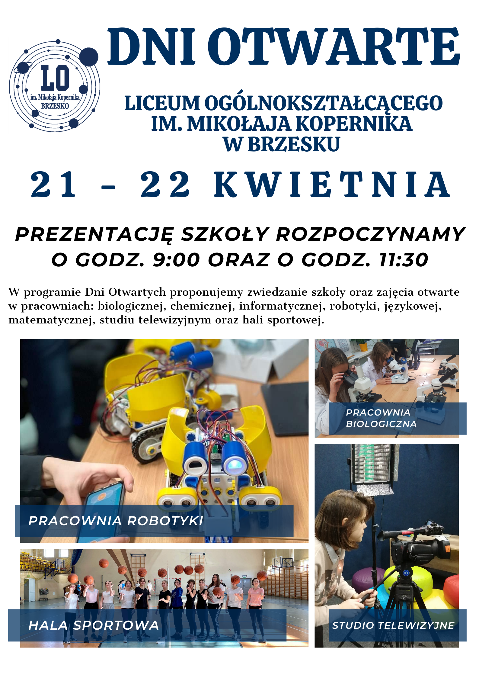 Zapraszamy na dni otwarte Liceum Ogólnokształcącego im. Mikołaja Kopernika w Brzesku. Szkoły zainteresowane udziałem zachęcamy do kontaktu telefonicznego w celu rezerwacji terminu. Dodatkowych informacji udziela sekretariat szkoły w godzinach od 8:00 do 15:00 pod numerem telefonu (14) 68 63 837 lub e-mail: sekretariat@lobrzesko.edu.pl