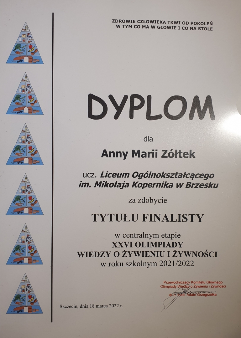 Ania Żółtek uczennica klasy 3AO uzyskała tytuł finalisty Olimpiady i znalazła się w gronie 30 najlepszych z całej Polski!!!!