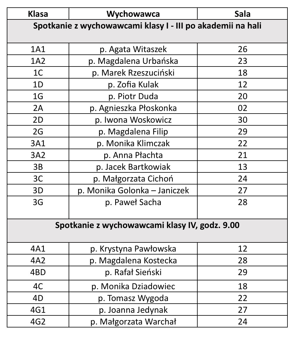 Spotkanie z wychowawcami klasy I - III po akademii na hali. Harmonogram spotkań z wychowawcami w załączniku.